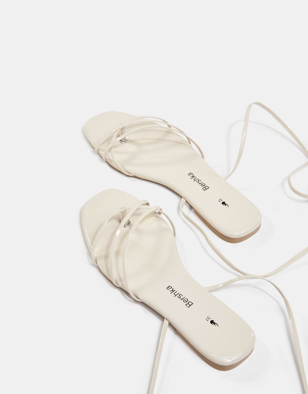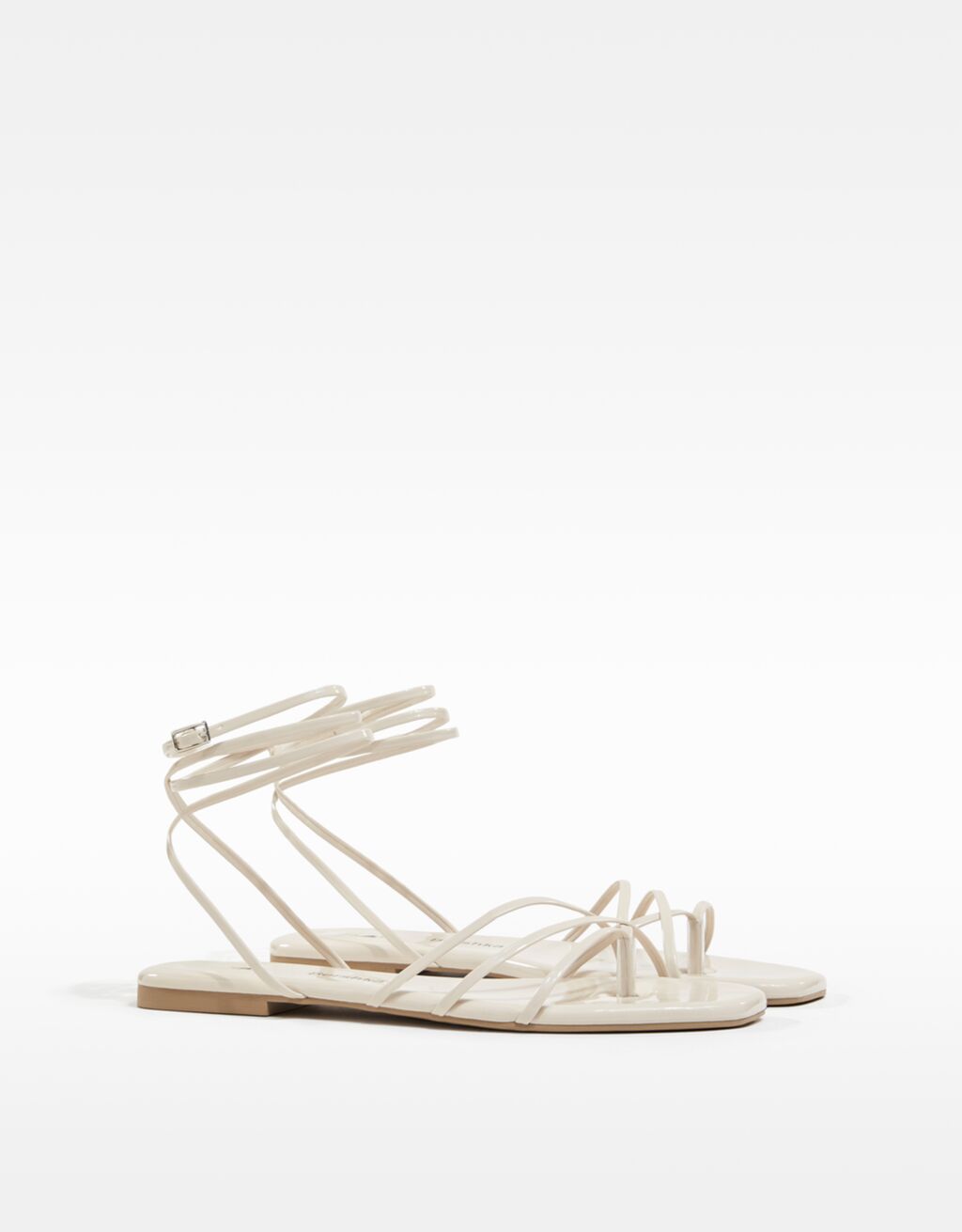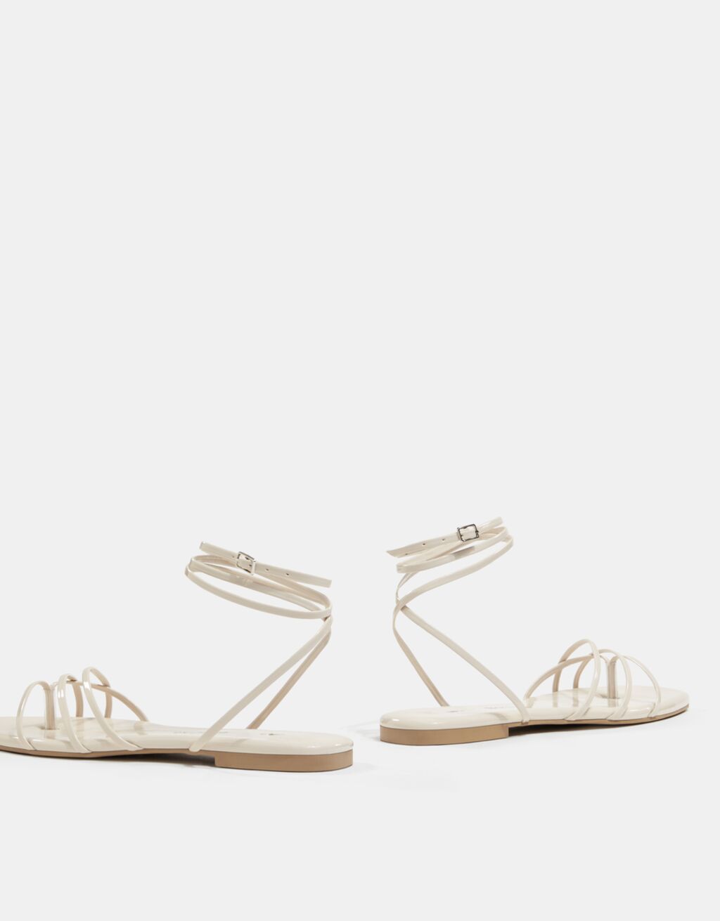 Bej suni rugan düz sandalet. Tokalı bilek bantlı.
