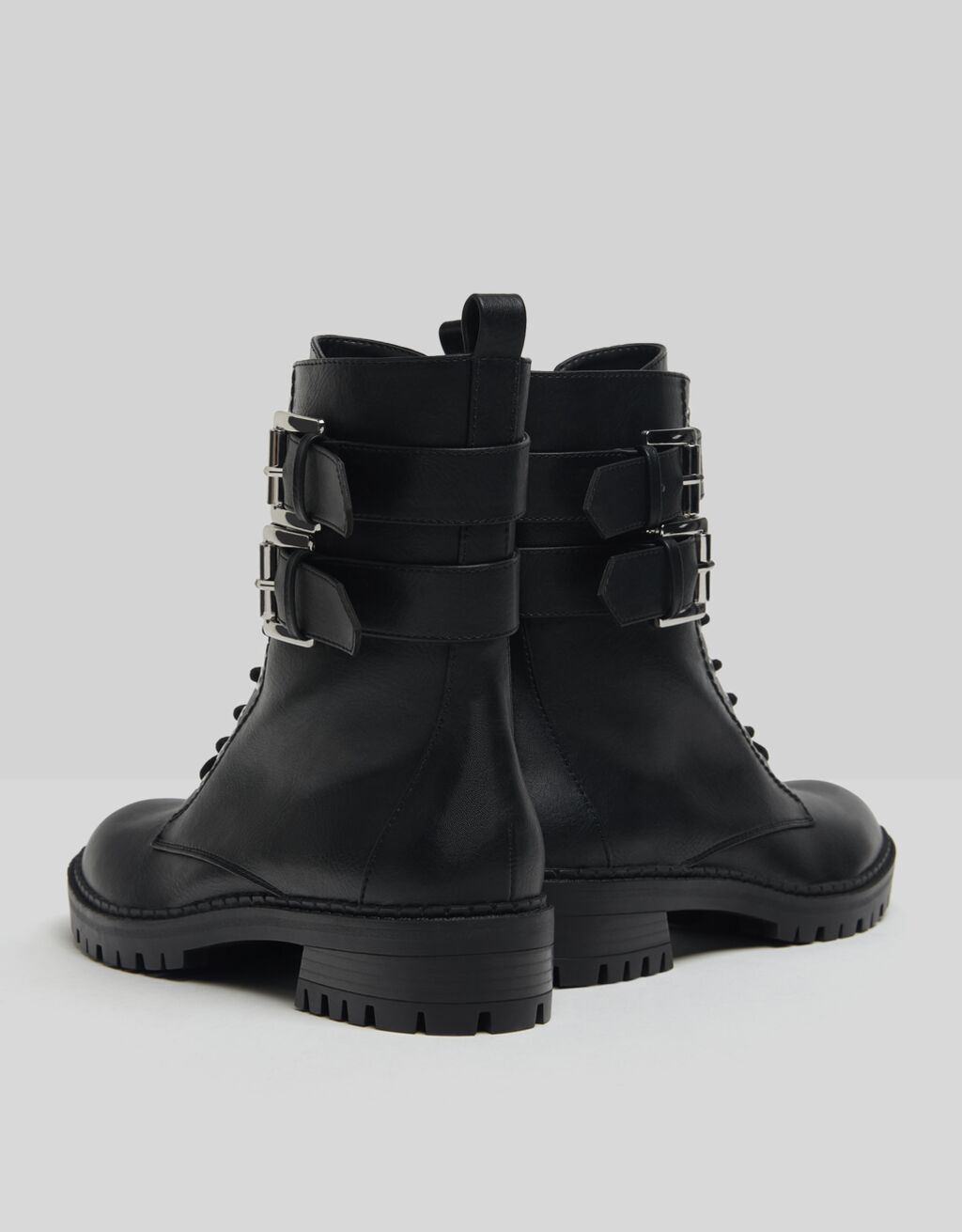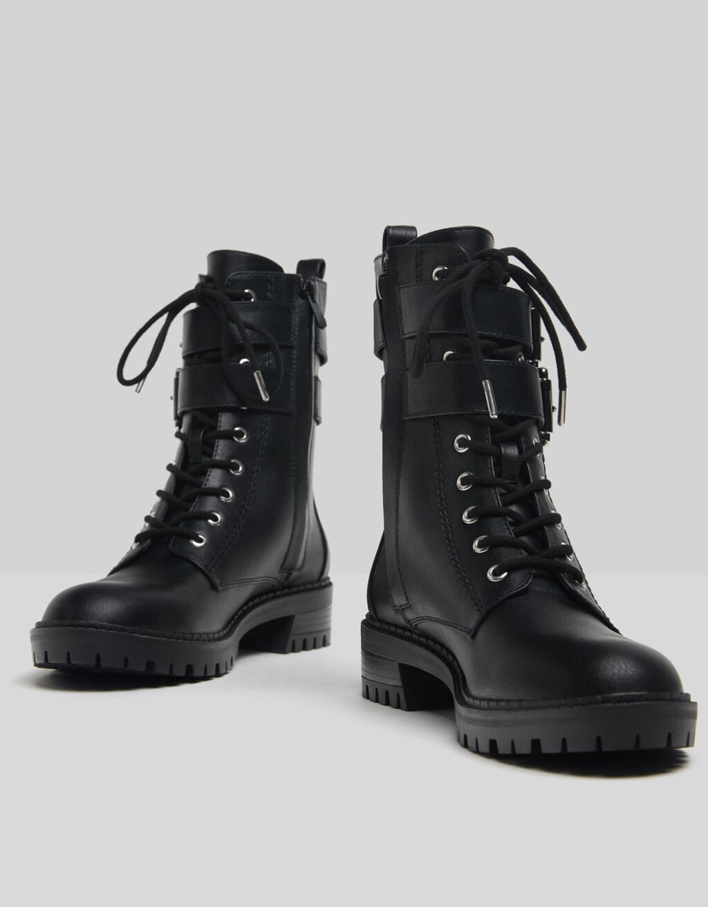 Siyah düz bilekte bot. Tokalı bantlı ve fermuar kapamalı.